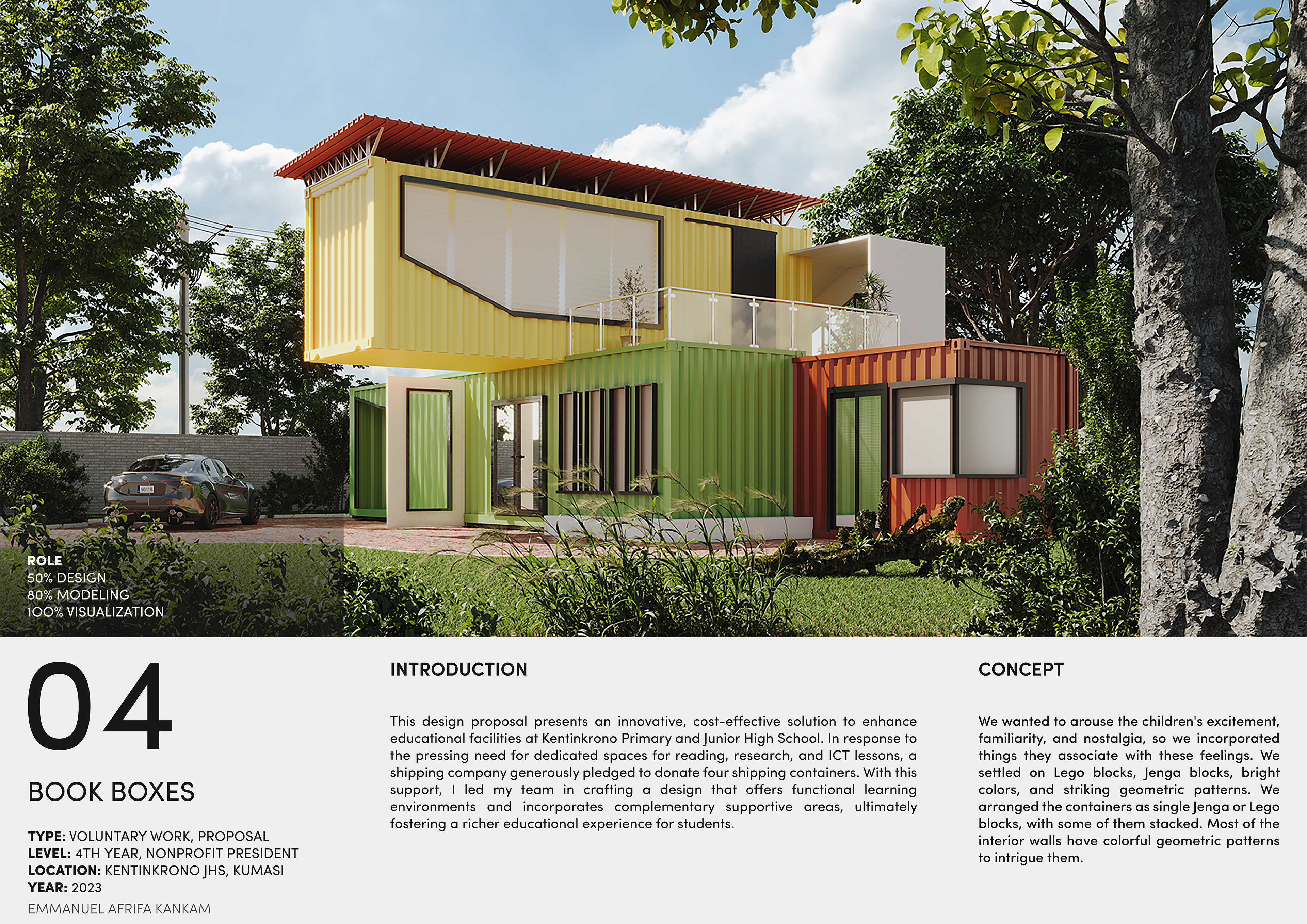The project repurposes four donated shipping containers into a compact campus for reading, research, and student support spaces at Kentinkrono JHS, Kumasi. Containers are treated not as finished rooms, but as structural assets—robust, modular, and immediately available—around which comfort and identity must be designed. The real design challenge is not only space-making; it is climate-making: in Kumasi, heat and glare can quickly undermine concentration and wellbeing.
