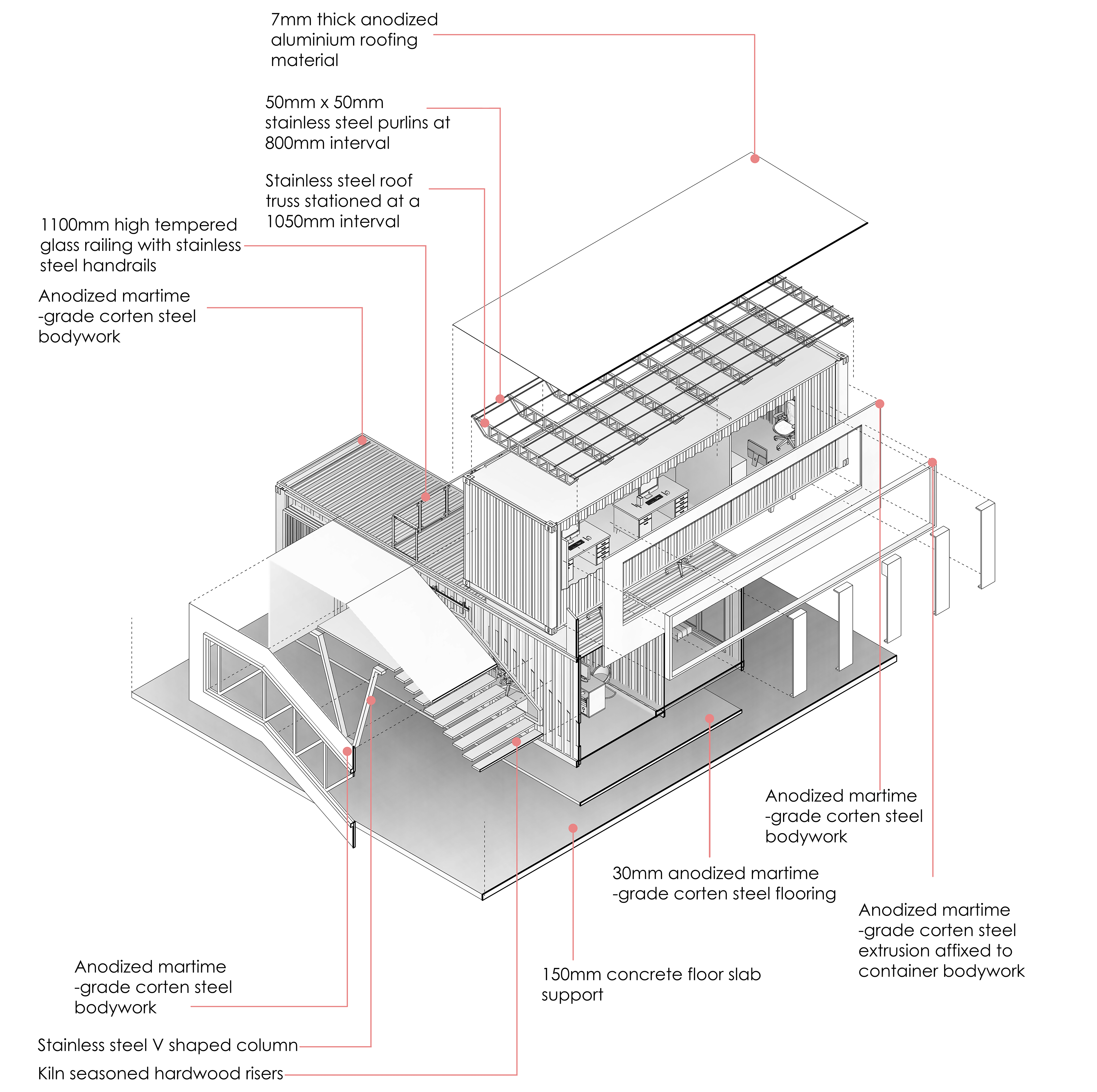 Thermal moderation: Where interior comfort needs reinforcement, the container envelope is upgraded with targeted insulation and an internal lining that reduces radiant heat from the metal shell.