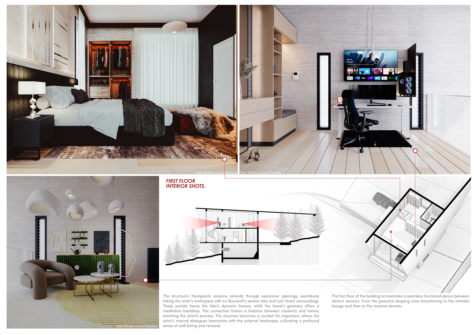 First Floor (The Spirit) – The studio and sleeping quarters float in light. The workspace faces the lake, offering uninterrupted visual serenity; the bedroom remains introverted and calm. Together, they embody the artist’s dual existence—solitary yet connected to the vast world beyond the glass.